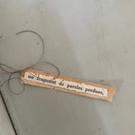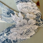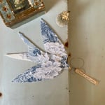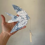 Délicate suspension hirondelle en toile de Jouy ornée de dentelle ancienne et d un mot glané dans un livre ancien